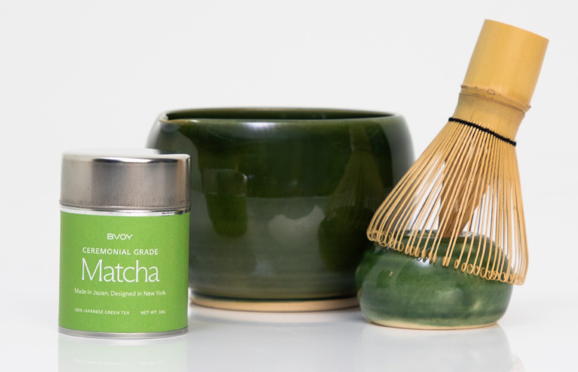 Now I finally get to give our community the tools to do that with our BVOY Matcha Holiday Box. It includes a handcrafted bowl and whisk holder we made with Happy Medium, the whisk itself, a scoop for measuring, a sifter to make the matcha extra smooth, our ceremonial-grade matcha, and illustrated instructions by Kate McDuffie so anyone can make a beautiful cup of matcha through the BVOY lens.